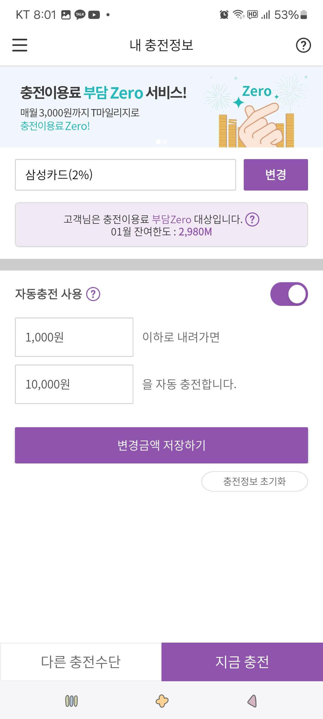 '부담 zero'는 매월 1일마다 T마일리지 3,000M 내에서 충전수수료를 자동으로 차감하여 결제되므로 충전수수료에 대한 부담이 없습니다.