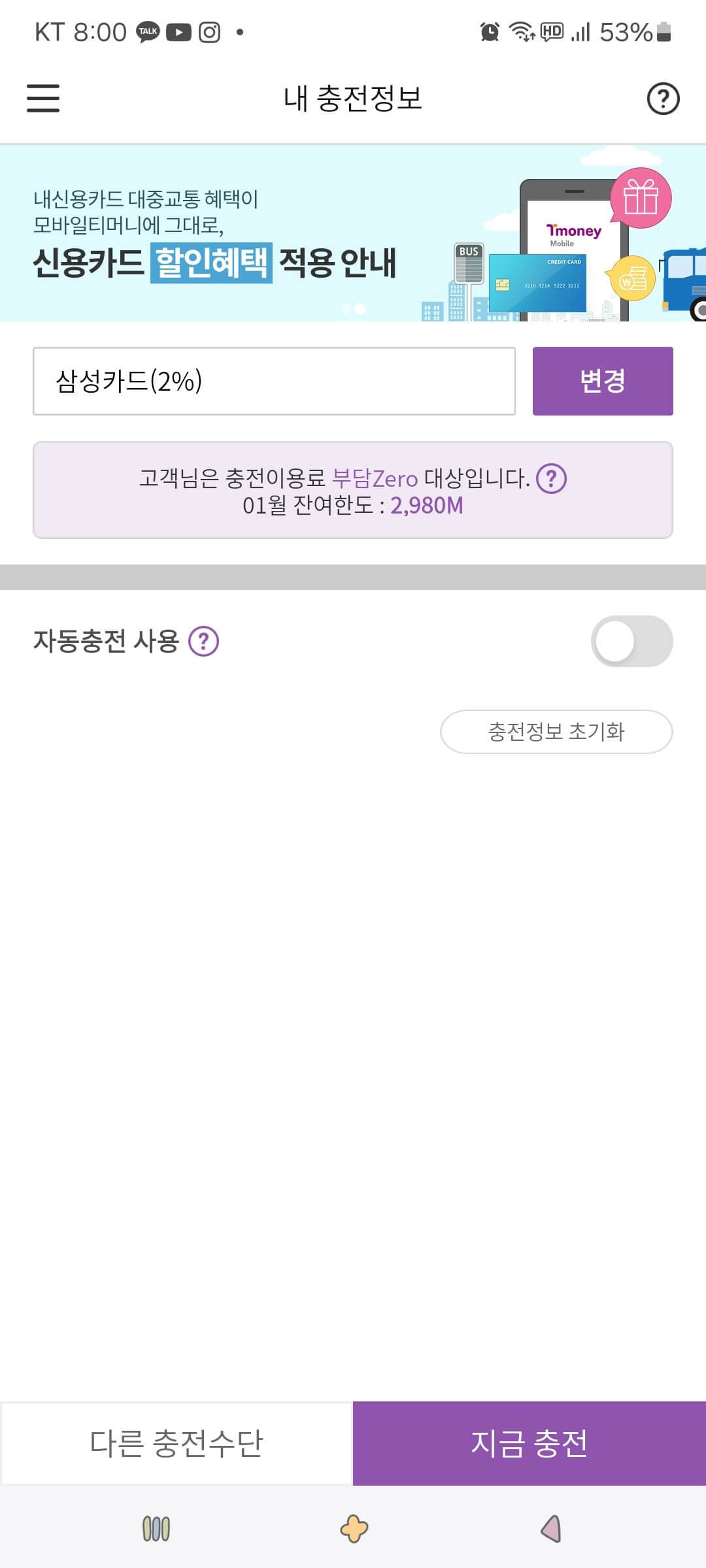 모바일 티머니 충전하는 방법은 아주 간단합니다. 모바일 교통카드 등록이 완료되었다면 언제든지 충전할 수 있는데요. 필요할 때마다 충전하는 방법이 있고 잔액이 설정한 금액 이하로 남으면 자동으로 충전되는 자동충전 방법이 있습니다.