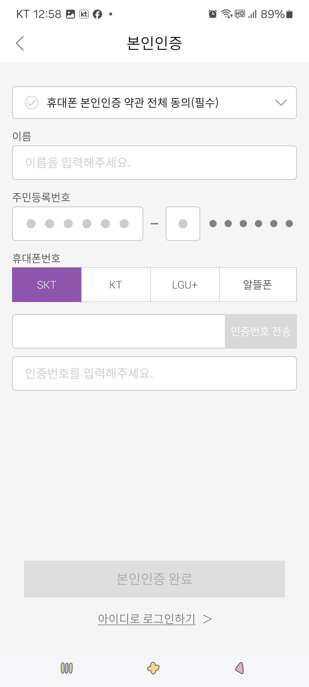 6. 본인인증 화면에서 개인정보를 입력 및 약관에 동의한 후 [확인] 버튼을 누릅니다.
