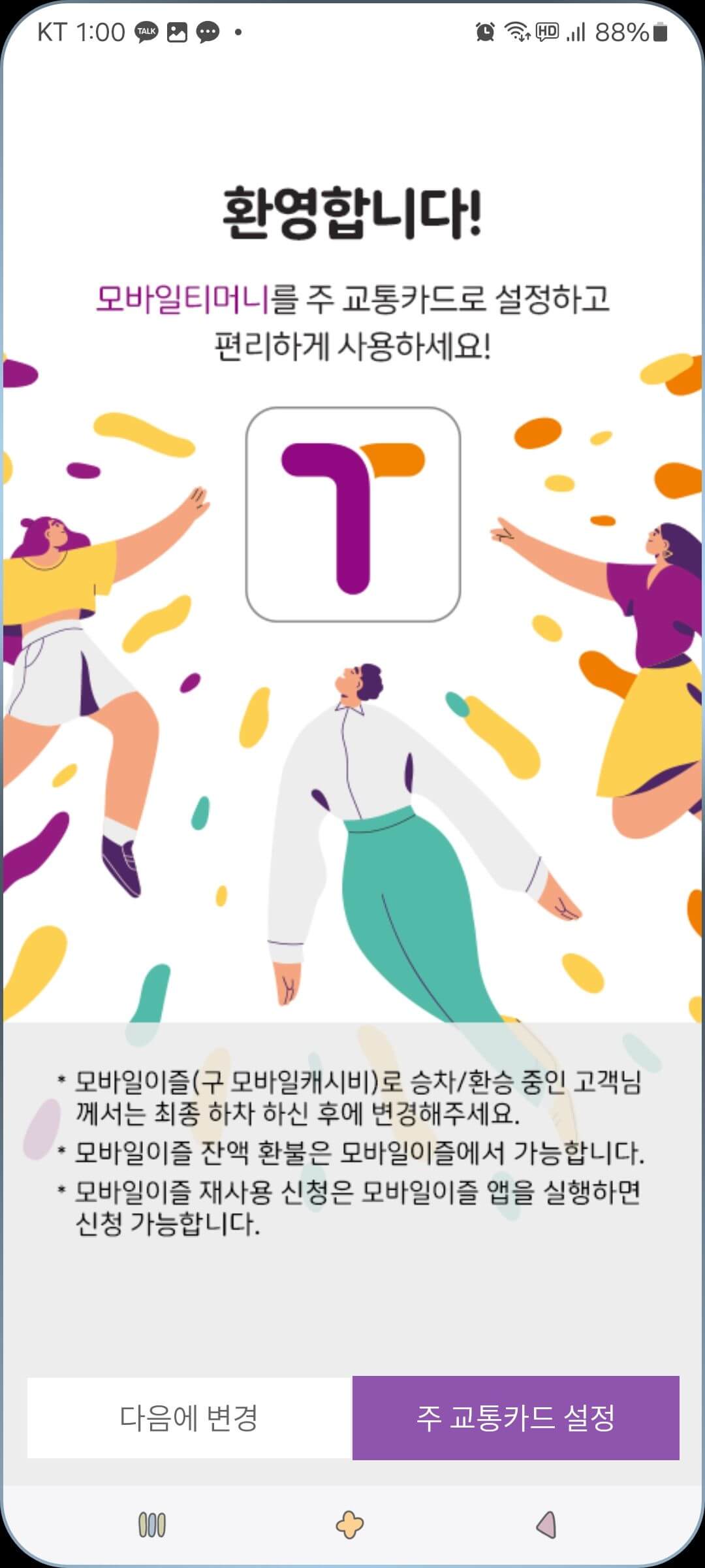 7. 모바일 티머니 설치 완료되었습니다. [주 교통카드 설정] 버튼을 누릅니다.