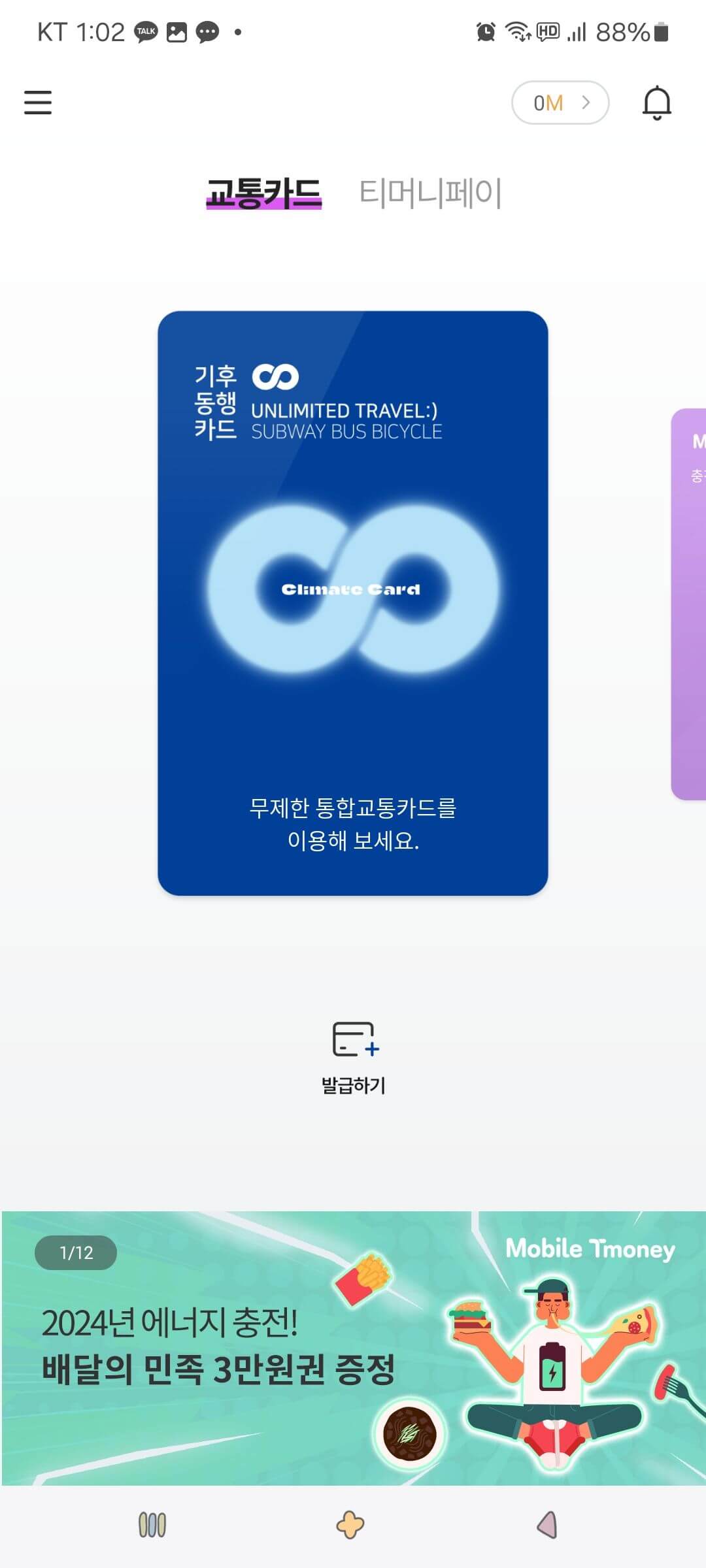 모바일 티머니에서는 대중교통 할인 카드나 기후동행카드 등을 모바일 티머니에 등록하여 모바일 교통카드로 사용할 수 있으며 모바일 티머니 사용자를 위한 혜택도 제공하고 있습니다.
