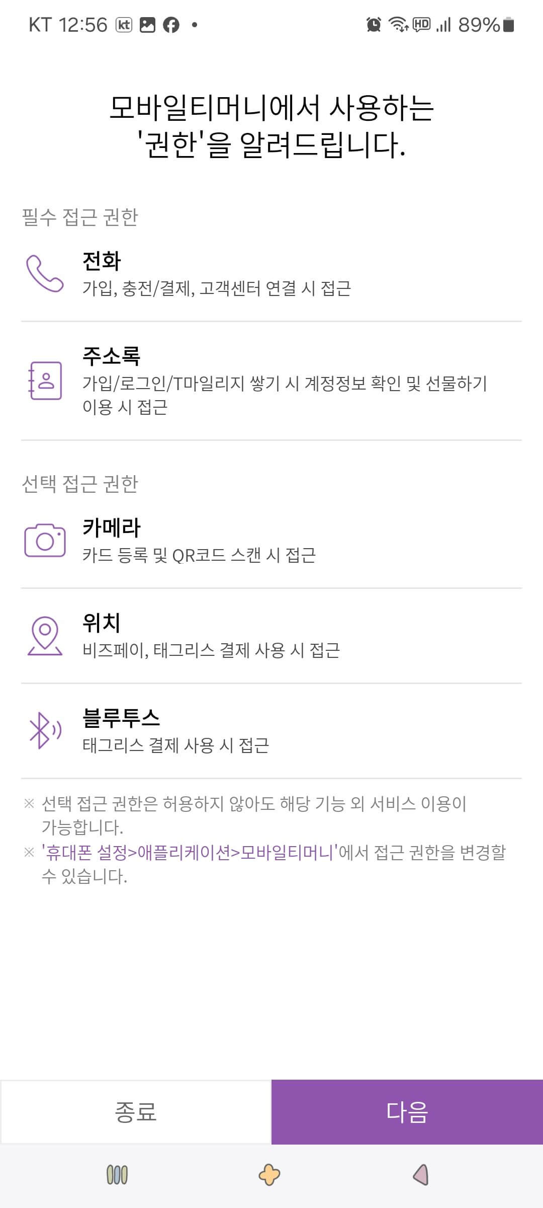 3. 모바일티머니 사용권한 안내를 확인한 후 [다음] 버튼을 누릅니다.