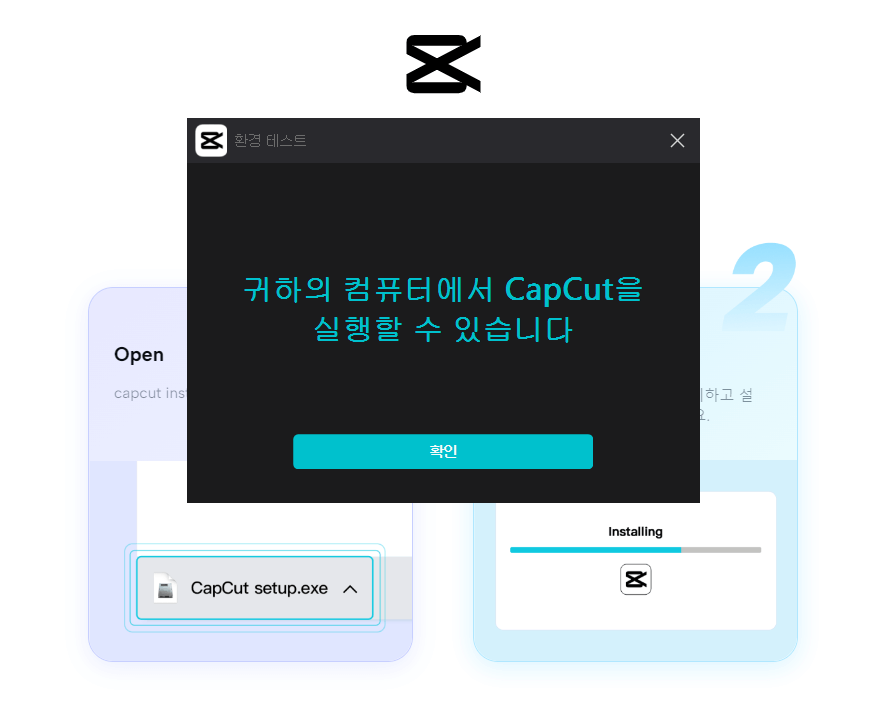 5. '귀하의 컴퓨터에서 capcut을 실행할 수 있습니다' 화면이 뜨면 '확인' 버튼을 누릅니다. 드디어 캡컷 pc 다운로드 완료입니다.