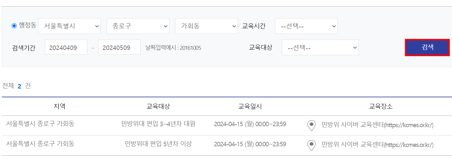 - 민방위 교육 일정은 국민재난안전포털 사이트에 접속한 후 민방위 > 교육 훈련 > 교육일정 > 지역입력 후 검색 버튼을 선택하시면 거주지역의 해당하는 교육대상자와 교육일정을 확인할 수 있습니다.