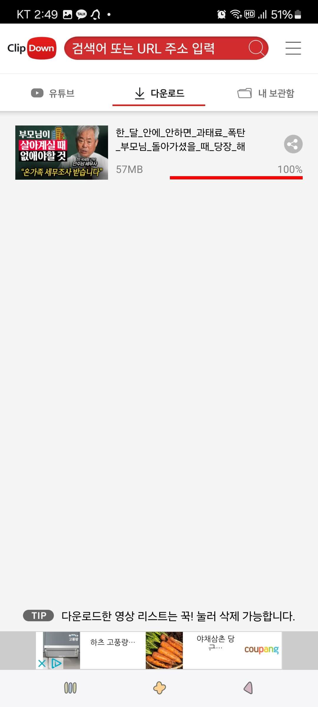 3. 유튜브 영상이 다운로드됐습니다. 내 보관함에서 수시로 볼 수 있습니다.