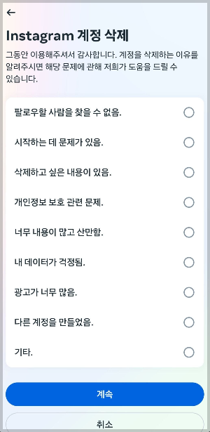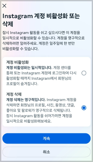 인스타 추가계정 삭제하는 방법은 위의 과정과 동일합니다. 비활성화 또는 삭제 페이지에서 영구 삭제할 추가계정을 선택한 다음 계속 버튼을 선택합니다.
