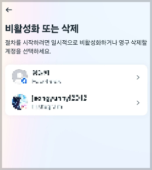 1. 비활성화 또는 삭제 페이지에서 삭제할 추가계정 선택한 다음 계속 버튼 선택합니다.
