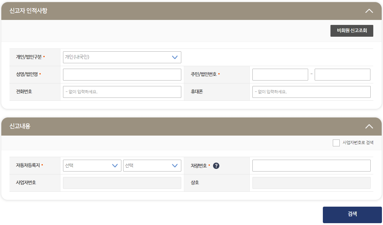 ● 신청정보와 차량정보를 작성한 후 [검색] 버튼을 선택합니다.