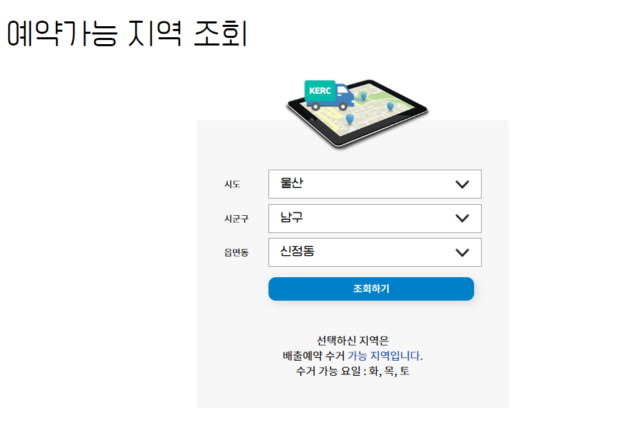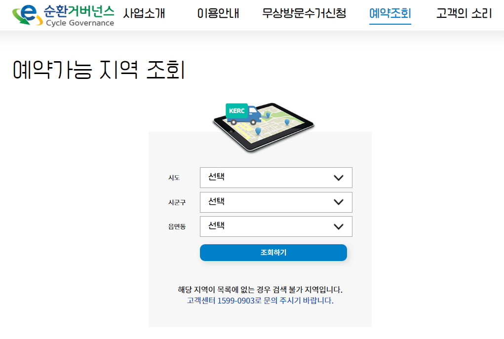 내가 살고 있는 지역이 무료 수거 가능 지역인지 아닌지 폐가전 무료 수거 홈페이지에서 지역 조회를 할 수 있습니다. 예약 가능 지역 조회 방법은 아주 간단하니 바로 조회해 보세요.