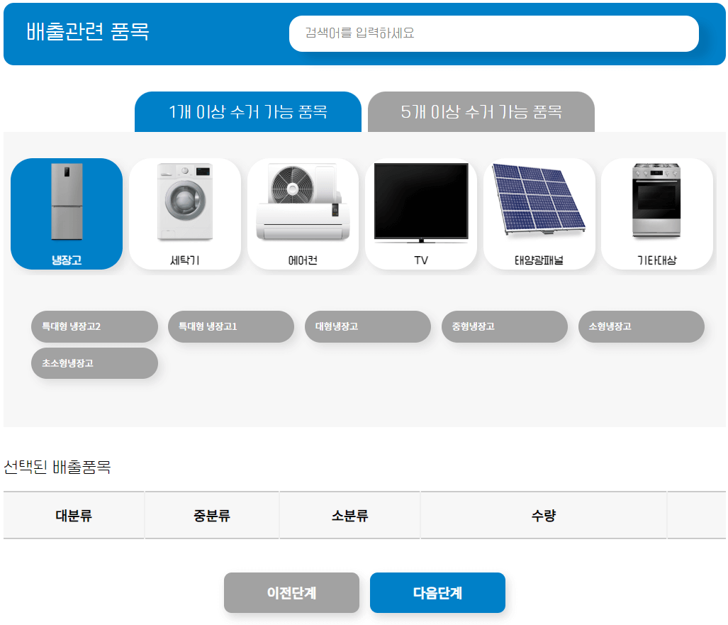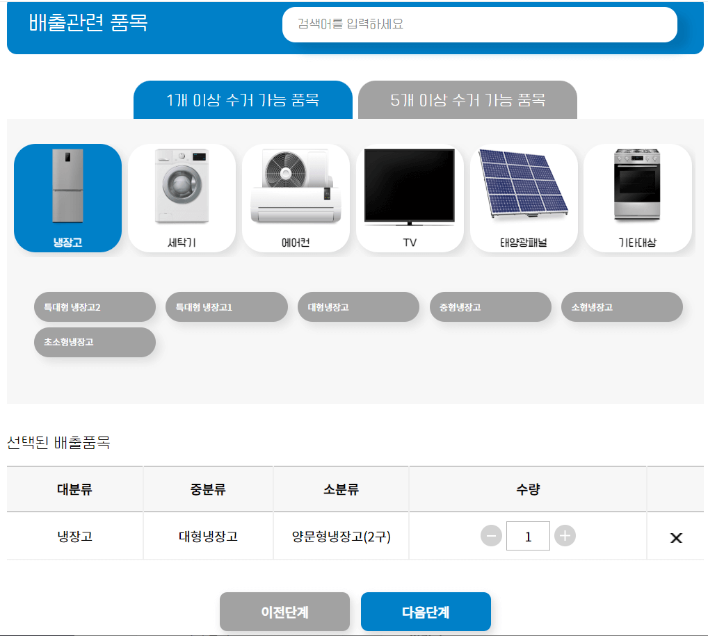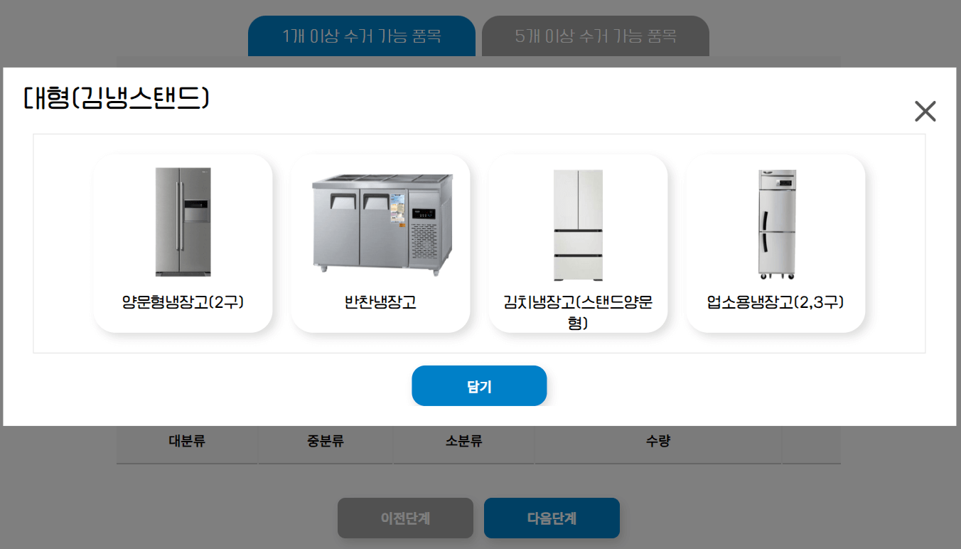 - 만약 냉장고를 버리시면 냉장고를 선택한 후 사이즈에 맞는 냉장고를 선택합니다.
