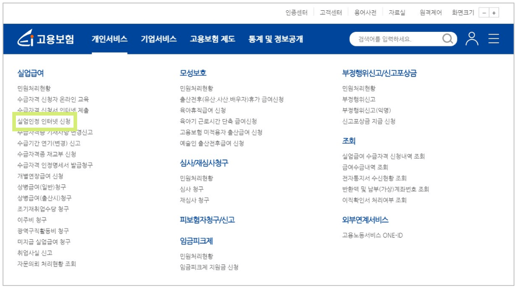 2. 첫 화면에서 '개인서비스' 버튼 클릭 후 실업급여 메뉴에서 '실업인정 인터넷 신청' 버튼을 클릭합니다.