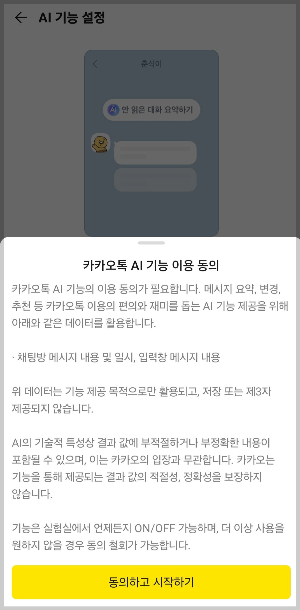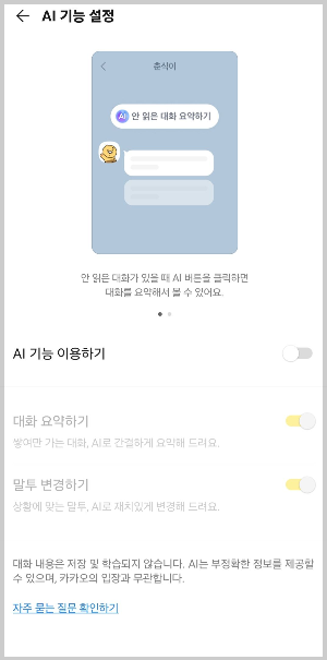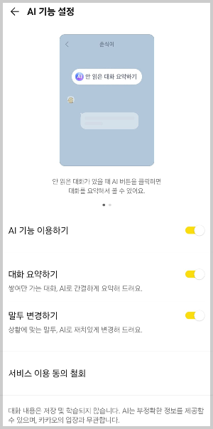 3. 'AI 기능 이용하기' 오른쪽 버튼을 눌러 활성화하면 카카오톡 AI 기능 이용에 대한 내용이 나옵니다.