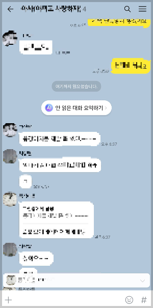 1. 메시지가 쌓여 있는 채팅방으로 이동하면 안 읽은 부분에 'AI 안 읽은 대화 요약하기' 버튼이 있습니다.