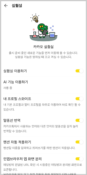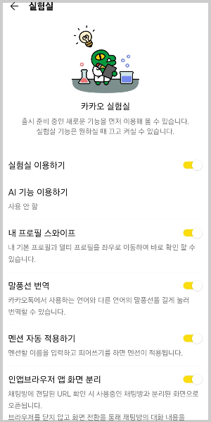 2. '실험실 이용하기' 오른쪽 버튼을 눌러 활성화를 시킨 다음 아래의 'AI 기능 이용하기'를 선택합니다.