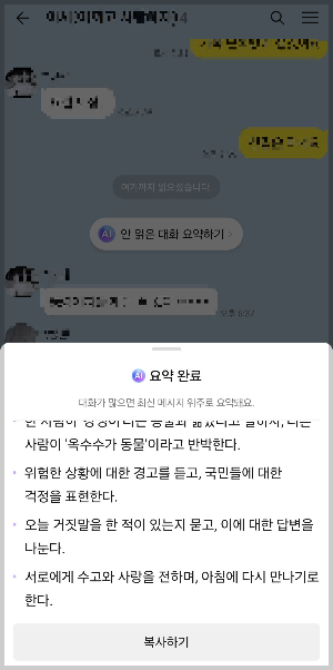 2. 'AI 안 읽은 대화 요약하기' 버튼을 누르고 잠시 기다리면 AI가 요약한 내용을 보여줍니다.