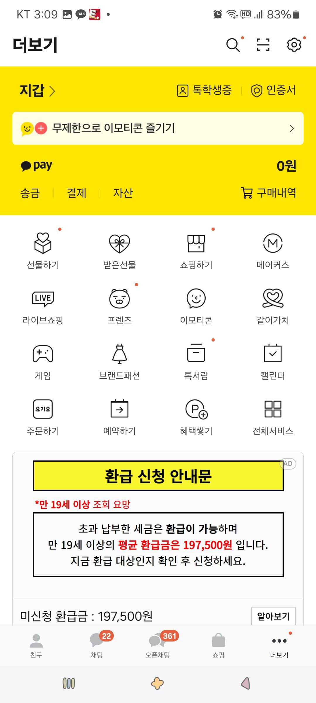 1. 카톡 앱을 실행하고 하단의 '더 보기' 버튼을 선택합니다.