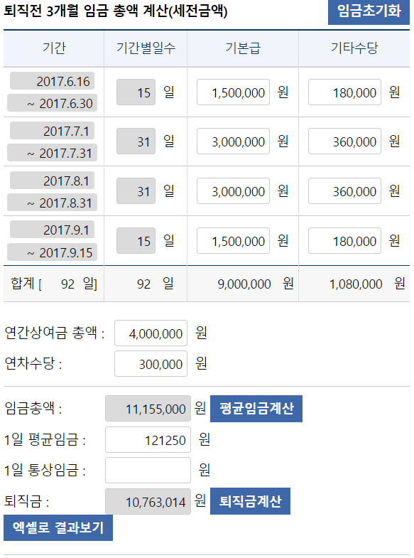 ≫ 퇴직 전 3개월 임금총액은 월기본급과 월기타수당, 상여금가산액, 연차수당가산액을 전부 합산한 금액입니다.