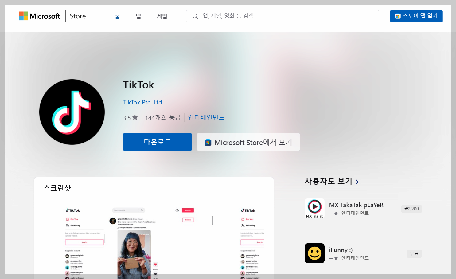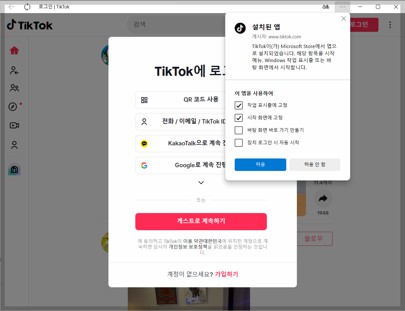 5. 마이크로소프트 스토어에서 아래로 내려 틱톡앱을 설치합니다. 설치가 완료되면 틱톡 pc버전 창이 바로 열립니다. 설치된 앱 팝업창에서 [허용] 버튼을 누르면 틱톡 PC버전 설치 완료입니다.