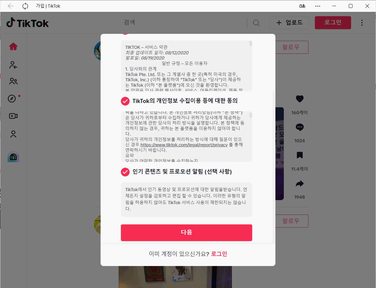 3. 틱톡 이용 약관에 체크한 다음 [다음] 버튼을 선택합니다.