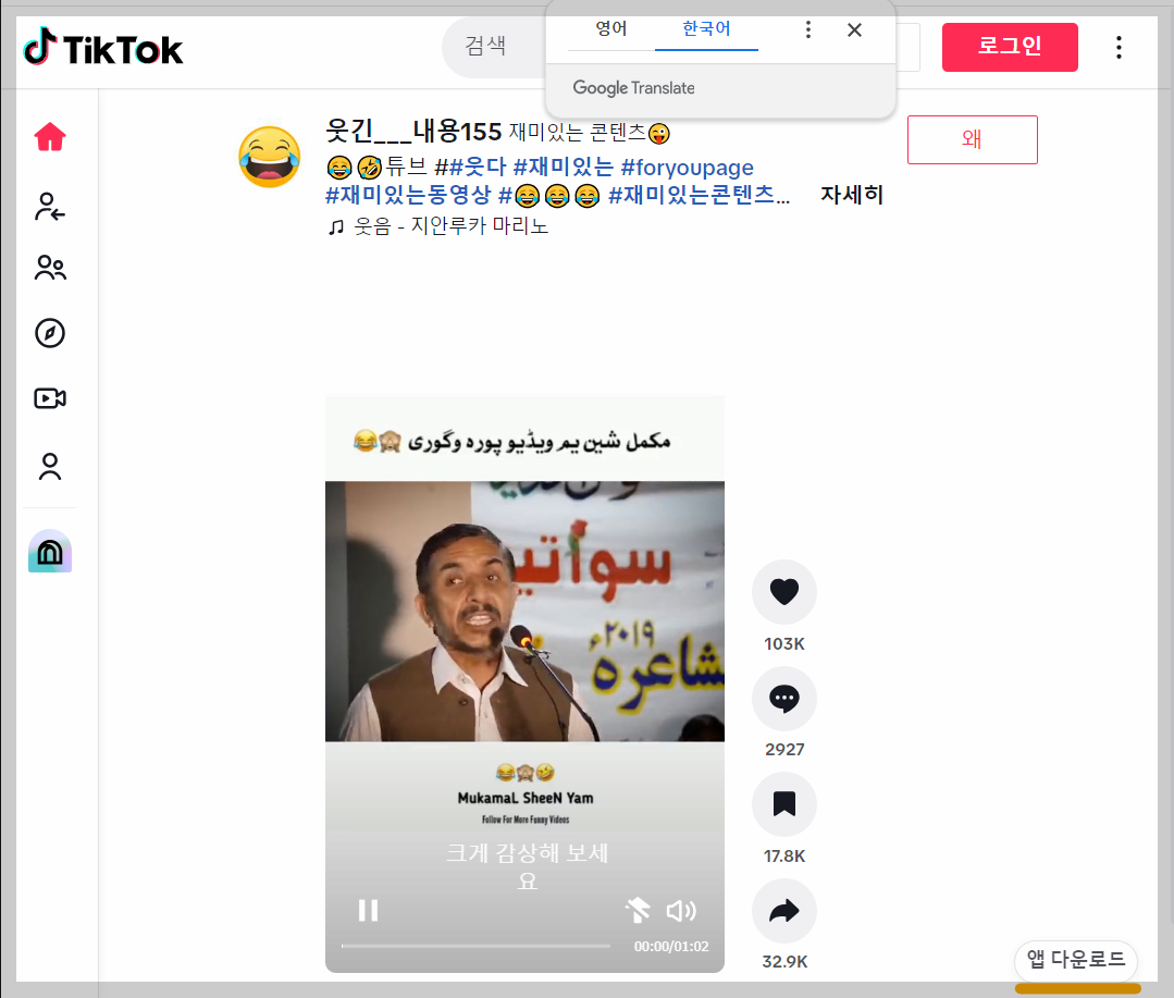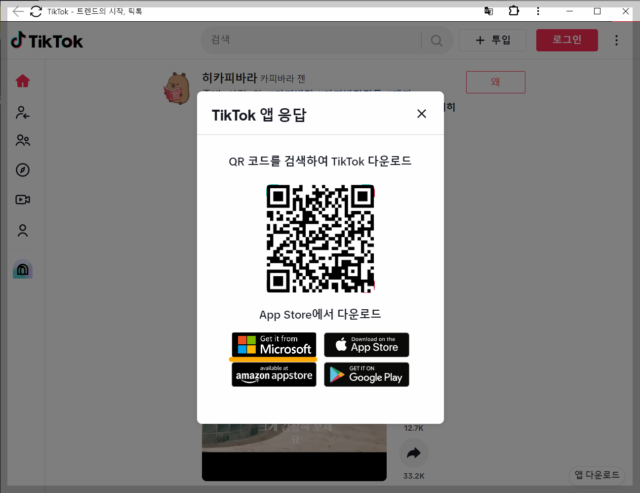 틱톡 홈페이지 오른쪽 하단 [앱 다운로드] 선택하면 앱 설치 팝업창이 열립니다.