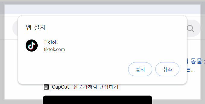 2. 틱톡 홈페이지에서 오른쪽 하단의 [앱 다운로드] 버튼을 선택하면 앱 설치 팝업창이 뜹니다. 여기서 [설치] 버튼을 선택하여 한번 더 [앱 다운로드] 버튼을 누릅니다. [틱톡 앱 받기] 팝업창으로 이동합니다.