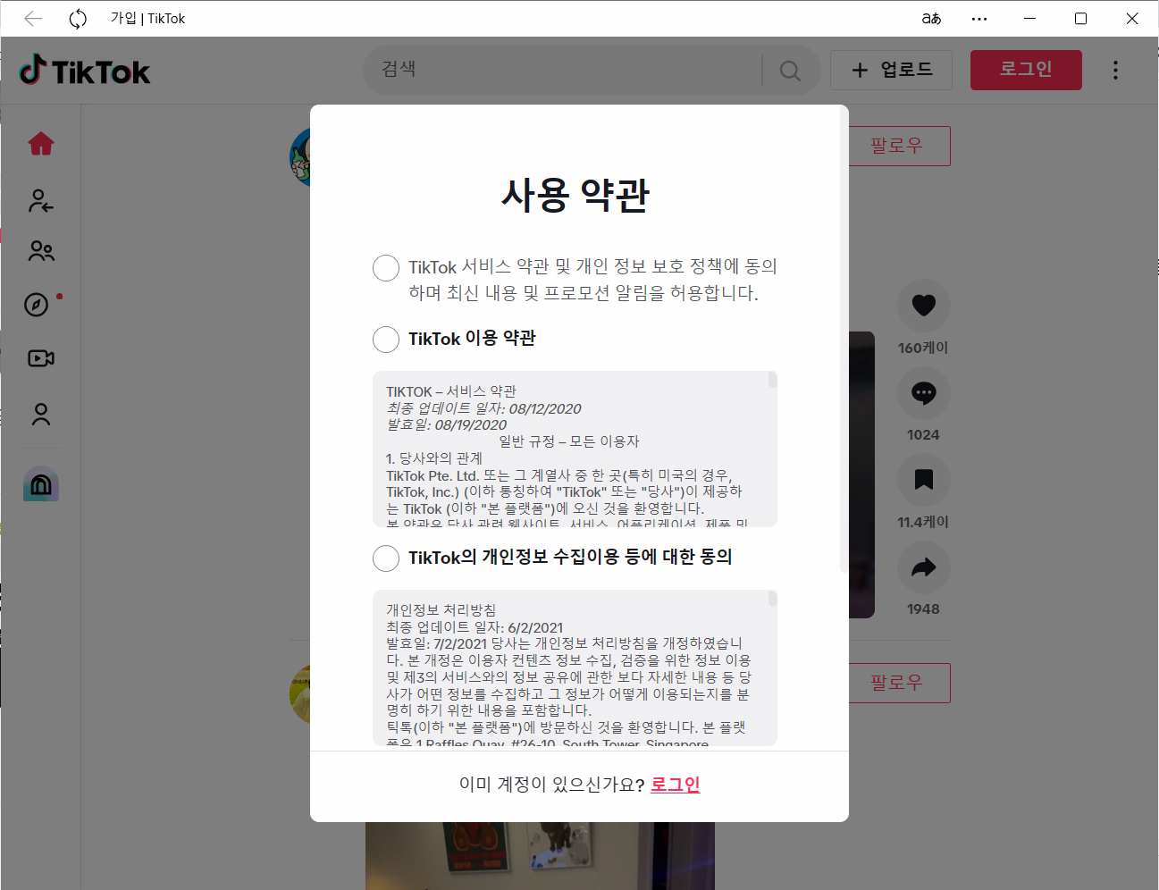 2. 틱톡 이용 약관 및 개인정보 수집이용에 동의하는 내용 확인 후 체크합니다.