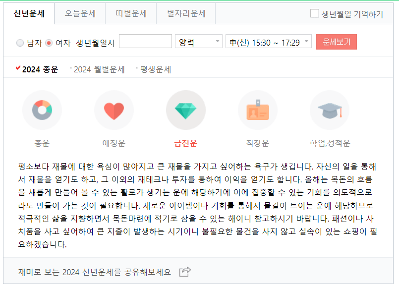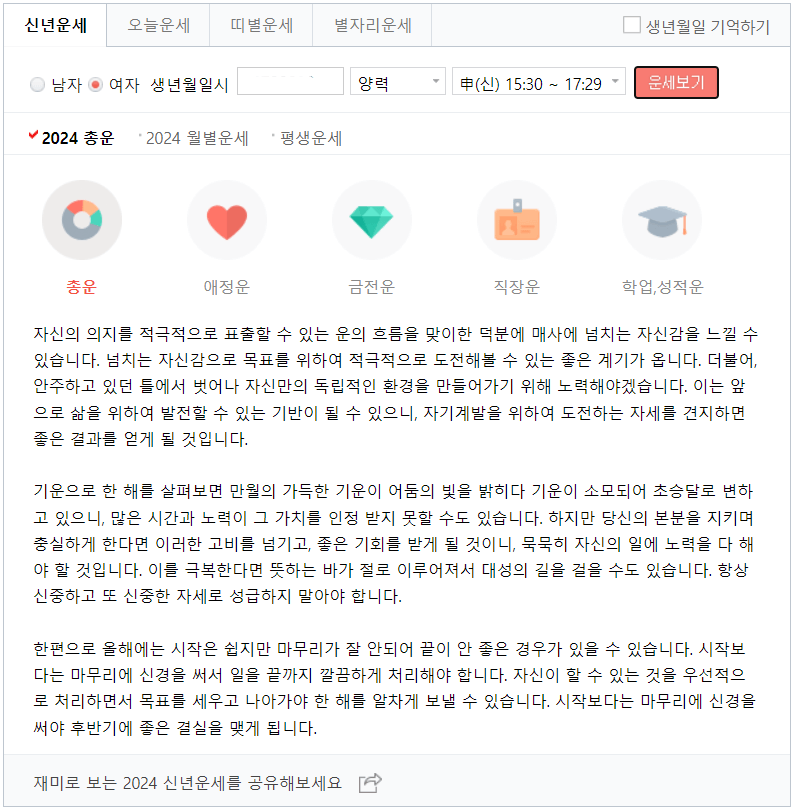 - 2024 총운, 2024 월별운세, 평생운세를 확인할 수 있습니다.