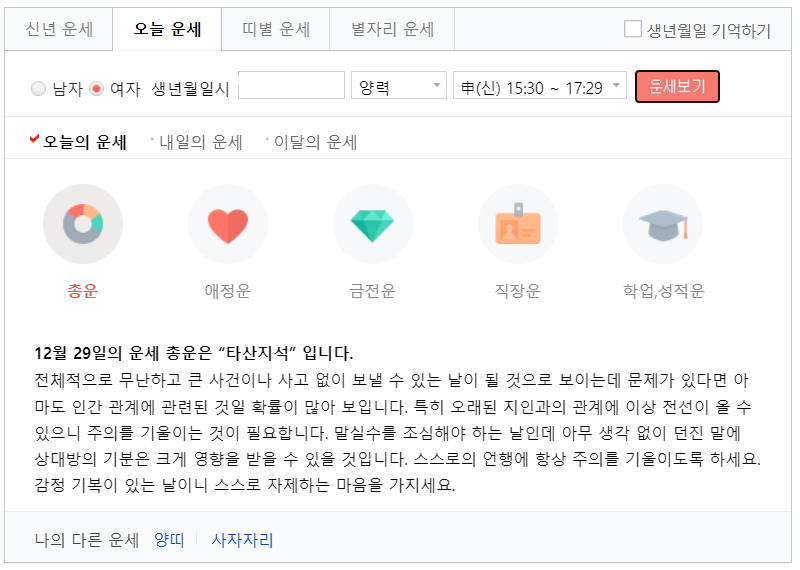 - 오늘의 운세 총운, 애정운, 금전운, 직장운, 학업운 등을 확인할 수 있습니다.